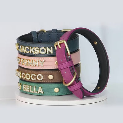Personalized Crystal Dog Collar – Custom Name Leather Collar with Optional Leash