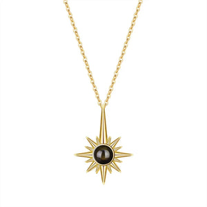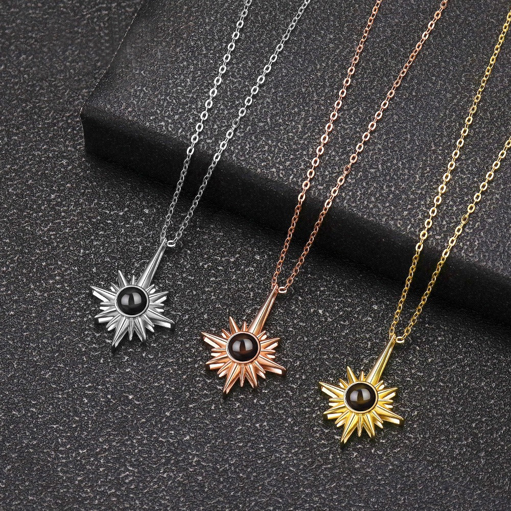 This sunflower photo projection necklace by Metis Grace is crafted from S925 sterling silver and designed to symbolize warmth, hope, and everlasting love. Inside the projection stone, your chosen photo is delicately preserved—revealed when light shines through.